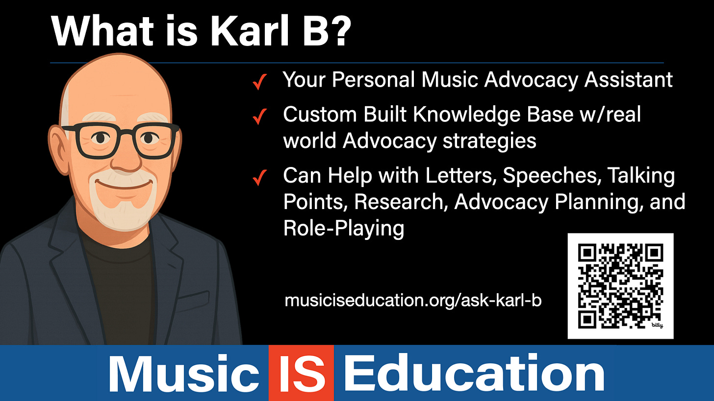 Whether you need a three minute speech for a school board meeting, a letter to an administrator to protect funding, a case making document on the connection between music education and workforce skills, real-world examples of successful advocacy initiatives, or a collection of content for social media… Karl B is your best friend. Take Karl for a spin!